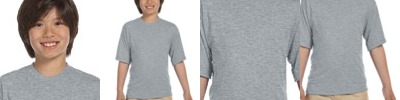 4.5 oz., 100% polyester; Moisture management jersey; Ribbed collar; Taped shoulder to shoulder with EasyTear™ label; Double-needle hemmed sleeves and bottom;