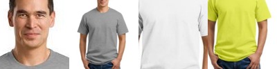 4.3 oz.,100% combed ring-spun cotton fine jersey; 32 singles; Fabric laundered for reduced shrinkage; 1x1 baby rib-knit set-in collar; Tear-away label; Made in the usa;