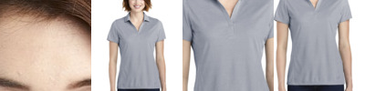 100% polyester heathered wicking knit top body, collar and sleeves ; 100% polyester wicking knit solid bottom body ; Wicks moisture away from the body ; Ladies' fit ; Pad print label ; Contrast self-fabric Johnny collar, placket, and yoke ; Contrast set-in sleeves ;