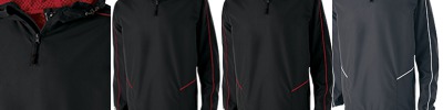 Key features include an adjustable, mesh-lined hood with eyelets and concealed cord locks for a snug fit, and a back vent with an adjustable closure, allowing full decoration access for custom branding. The jacket also boasts front zippered pockets for secure storage, half-elastic cuffs for a comfortable fit, and an open bottom with a hidden adjustable elastic drawcord for added flexibility.