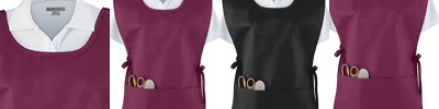 65% polyester, 35% cotton twill; Adjustable side ties; Center-divided pouch pocket; Self-fabric binding at neck and sides; 19" x 28";