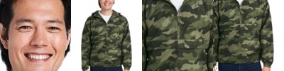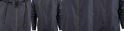 82 GSM, 100%polyester; Exterior water-resistant coating; Matte finish eyelets and zippers; Rubber zipper pull tab, reversed zipper tape; Fine mesh hood liner; Scuba neck, elastic binding on cuff; Welt pockets with mesh pocket bags; Storm flap cover on top of zipper to protect the neck; Toggle at waistband, locker loop in center neck;