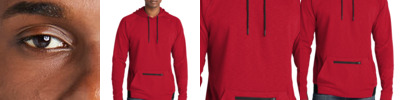 9.25 oz., 55% cotton 45% polyester heathered fleece; 1x1 yarndyed cuffs and waist; Lapover neckline with contrast lined hood; Set-on pouch pocket;