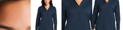 Lightweight and breathable, this moisture-wicking shirt has a pleasing drape, subtle jacquard texture and an open placket for feminine style.