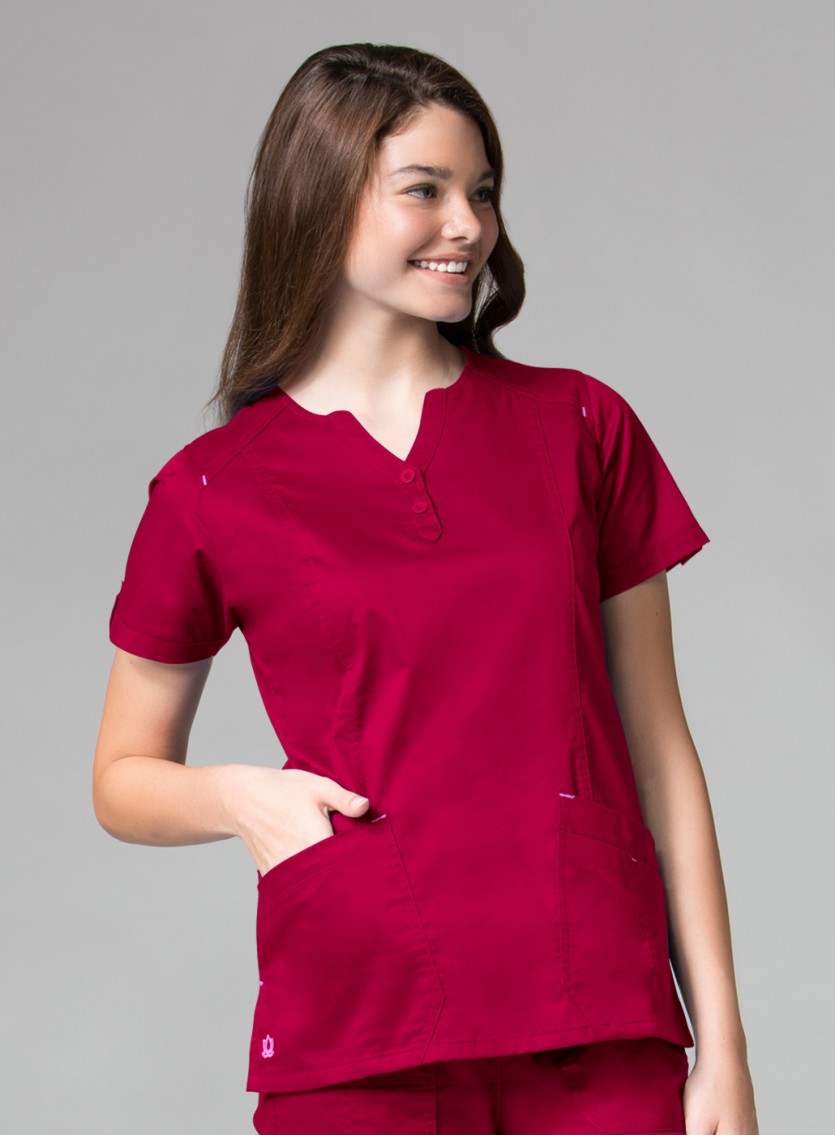 A missy fit, v-neck top features Dickies logo twill tape at the back neck, patch pockets, a stretchy knit interior pocket, and side vents. Center back length: 27".