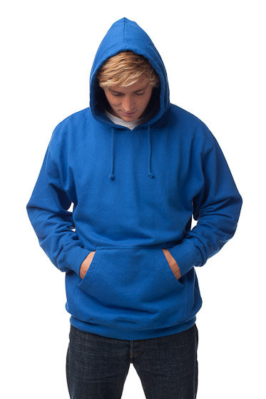 Our basic Men's pullover hooded sweatshirt is made with soft, mid weight fleece and generous fit for comfort. Features a jersey lined hood, heavy gauge drawcord with metal eyelets and 1x1 ribbing at cuffs and waistband.